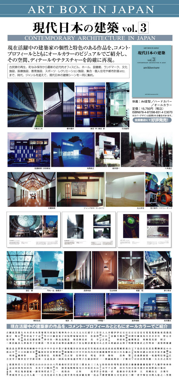 現代日本の建築 vol.3 建築と一口にいっても、個人住宅から大都市の設計まで多岐に渡りますが、 本書では多様に広がり、変化を見せる現代日本の建築シーンを幅広く展望する意味で、 古民家の再生、町なみ保存から最新の近代的オフィスビル、ランドマーク、文化施設、医療施設、 教育施設、集合・個人住宅や都市計画まで、時代やジャンルを超えて現代日本を代表する 現在活躍中の建築家から、新進気鋭の若手建築家まで、 150名を超える建築家の作品を収載しています。 税込価格:15,750円/332頁 詳細・購入 掲載作品の一部 詳細案内の表示