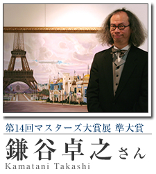 マスターズ大賞展について ART BOXマスターズ大賞展では、意欲的なシニア世代(45歳以上)を中心に、今まさに成熟しつつある作家を発掘し、サポートしてゆくことを主旨としております。今回の個展は、第14回の同展にて準大賞に輝いた鎌谷卓之さんの受賞を記念した企画展です。 次回